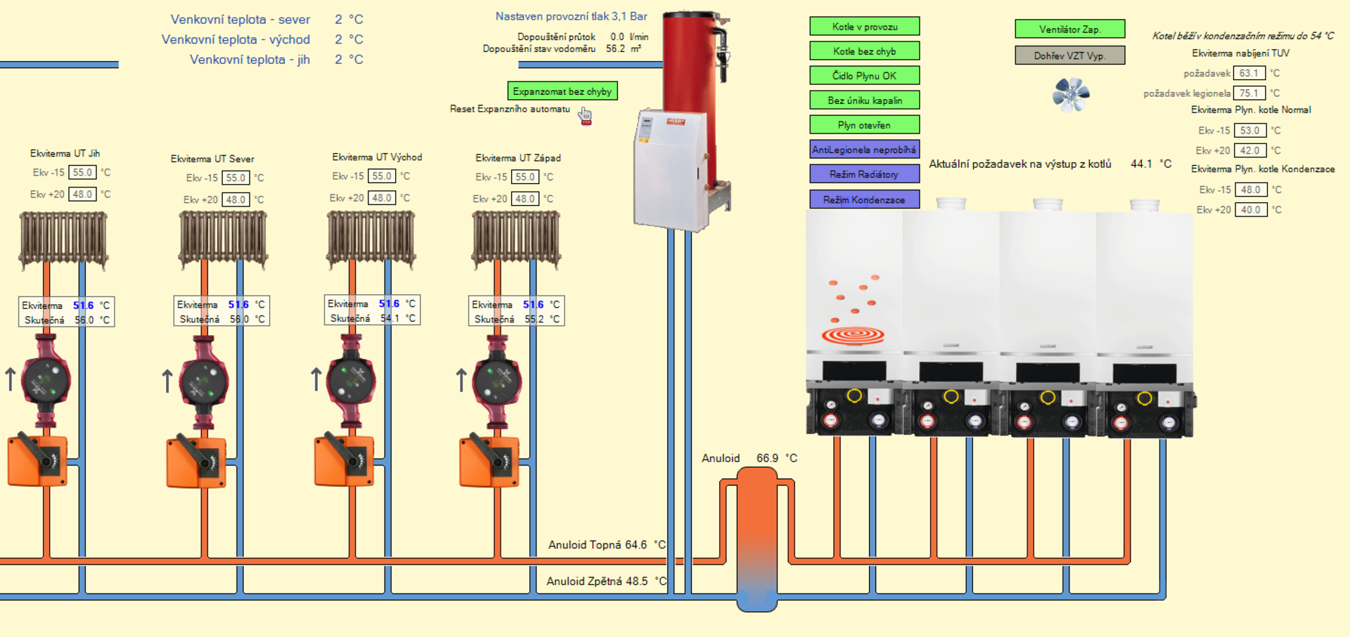 Kompletní výměna ležatých rozvodů, odpojení od teplárny a vybudování plynové kotelny o celkovém výkonu 400 kW s plně automatickým provozem a nepřetržitým vzdáleným dohledem.